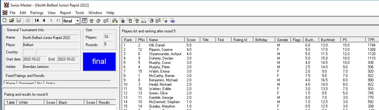 North Belfast Rapid 22nd Oct - tournament report