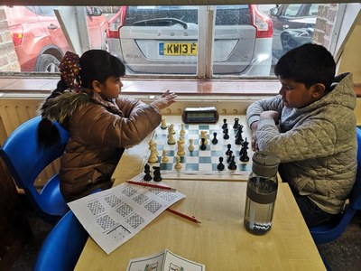 Players are given puzzle sheets with 22 puzzles to be solved during the afternoon. One side has mate in 1/2/3 the other has find the best combinations (slightly more challenging). Players are allowed to discuss puzzles but parents are asked to refrain from giving answers - we do give hints - but it is key that the youngsters find their own solutions. Some of these puzzles are elegent works of art. and the satisfaction of solving them is brilliant.