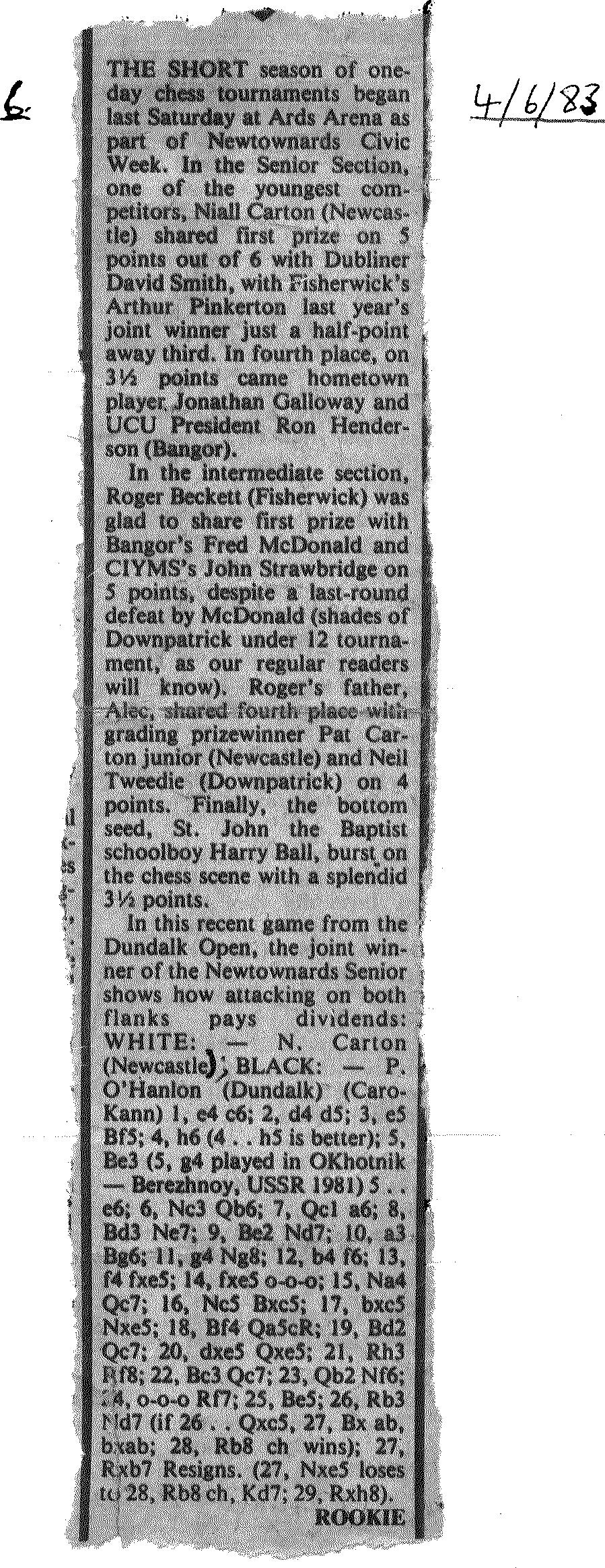 In the Intermediate Section, Roger Beckett (Fisherwick) was glad to share first prize with Bangor's Fred McDonald and CIYMS's John Strawbridge on 5 points, despite a last-round defeat by McDonald (shades of Downpatrick under 12 tournament, as our regular readers will know). Roger's father, Alex, shared fourth place with grading prizewinner Pat Carton junior (Newcastle) and Neil Tweedie (Downpatrick) on 4 points. Finally, the bottom seed, St. John the Baptist schoolboy Harry ball, burst on the chess scene with a splendid 3½ points.