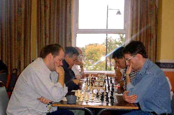 Nearest to the camera is the game between Mark Newman (on the left) and Michael Holmes, and immediately beyond them John Nicholson (on the left) is playing Timothy Douglas.