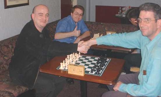 Bernard McCaughey, on the other side of the lens, shaking hands with Tom Clarke. Bernard resigned this game, only to then realise Tom's flag had fallen. This is also the first successful attempt to photograph a leprechaun. He is only invisible to the camera if he is wearing his green suit (Sorry, Tony).