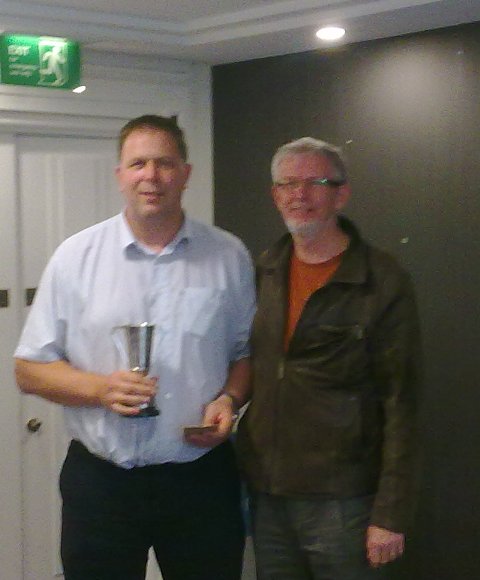 Ulster Intermediate Champion Steven Eachus, holding the Albert Long Trophy, with UCU Chairman Chris Kelly.