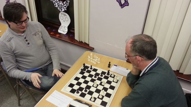 So when champions Fisherwick came to Ballynafeigh Community House for this week 3 fixture, the result may have seemed a forgone conclusion. Ballynafeigh 2 had an ace up their sleeve, though, in the form of Stephen Rush, who had apparently never played competitive over-the-board chess before this season, yet had a 100% record going into this encounter, thanks to victories over John Bryars and Richard Gould. His blistering start continued as in the first game to finish he defeated Ian Woodfield to put the home team into the lead.