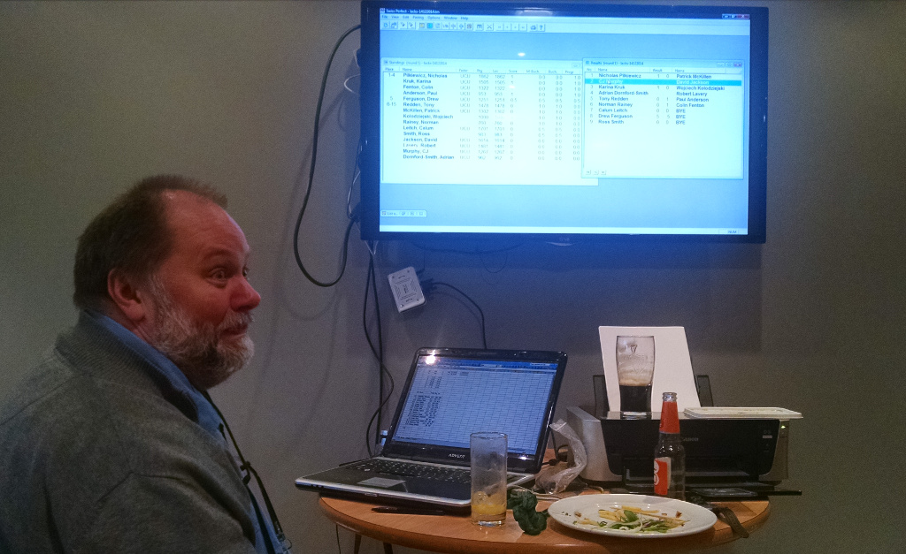 Mark Newman, Tournament Controller, trying to deny the evidence of an excellent repast provided by "Whistles" restaurant nextdoor